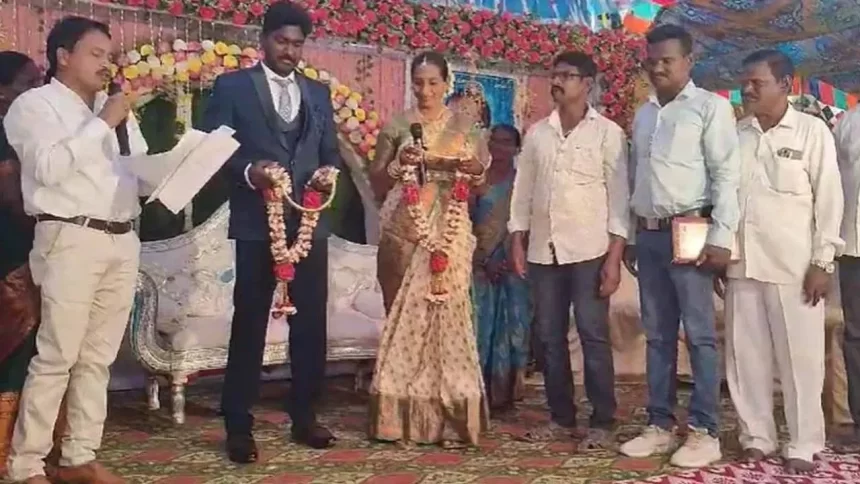 आंध्र प्रदेश के खम्मम जिले में एक अनोखी शादी हुई है. इस शादी में ना तो मंत्र पढ़ने के लिए कोई पंडित जी थे और ना ही कोई मंडप सजा था. एक साधारण से स्टेज पर दूल्हा और दुल्हन ने बाबा साहेब भीम राव अंबेडकर के चित्र के सामने एक दूसरे को माला पहनाई और फिर संविधान की शपथ लेकर विवाह के बंधन में बंध गए. इस मौके पर अंबेडकर के आदर्शों को मानने वाले लोग भी मौजूद रहे.